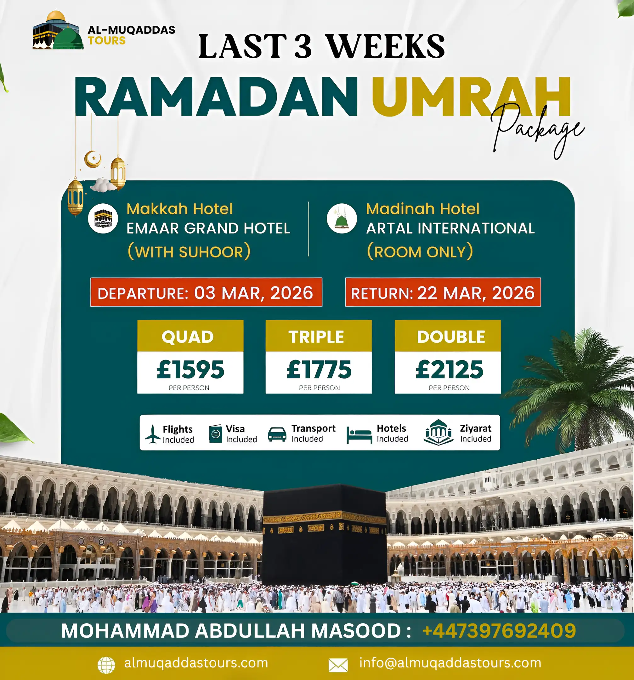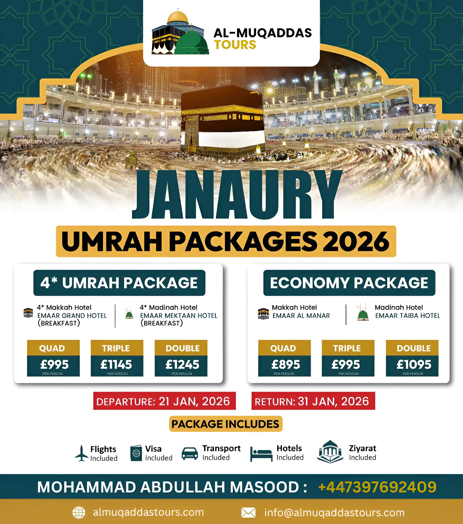 At al-Muqaddas Tours, we offer comprehensive Umrah packages from to Muslims across the UK, giving you everything you need for a peaceful trip to the holy lands.